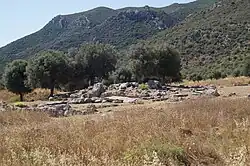 Der Zugang erfolgte über eine Rampe im Norden, die zu einem hellenistischen Propylon führte. Hierbei handelt es sich um einen Torbau von 12,80 m Länge und 8,50 m Breite. Der untere Teil der Umfassungsmauer, die in Polygonalmauerwerk ausgeführt ist, ist im Bereich des Propylon noch gut erhalten.