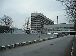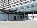 Blick auf das Bettenhaus, rechts das Funktionsgebäude, links das (blaue) Haus M, im Vordergrund die Rampe zur ehemaligen Notaufnahme (nur für Einsatzkräfte)