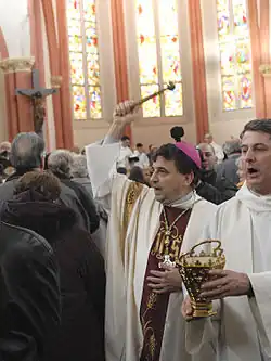 Die pfarrliche Gemeindemesse am Sonntag begann seit der Karolingerzeit mit dem Besprengen der Gemeinde mit geweihtem Wasser als Reinigungsritus, der auf die reinigende Kraft des Taufwassers zurückverweist.[1] Der Ritus des Taufgedächtnisses und der Reinigung kann in der sonntäglichen heiligen Messe das Schuldbekenntnis ersetzen. In der Osterzeit wird statt der Antiphon Asperges me das Vidi aquam gesungen, zum Besprengen wird dann das in der Feier der Osternacht geweihte Taufwasser genommen. Die Bezeichnung Asperges kann auch für den gesamten Ritus stehen.
