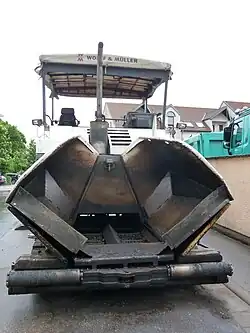 Der Materialbehälter des Fertigers befindet sich an der Front und dient zur Aufnahme des einzubauenden Materials. Das Fassungsvermögen liegt je nach Größe der Maschine zwischen 5 t und 14 t, welches durch Materialbehältereinsätze im Durchschnitt auf 20 t vergrößert werden kann. Die Seitenwände sind hydraulisch einklappbar und erlauben ein vollständiges Entleeren.