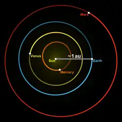 Dies entspricht mit einer Abweichung von nur 10−6 der großen Halbachse der Erdbahn und gleichzeitig dem mittleren Abstand zwischen Erde und Sonne (siehe hierzu Erdbahn).