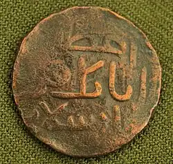 Der Titel اتاﺑﮏ (mittig, blank, ohne diakritische Punkte) auf einem Kupfer-dirham des Eldigüzidenherrschers Qizil-Arslan Uthman (reg. 1186–1191)