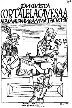 Daraufhin beschlossen Francisco Pizarro und Diego de Almagro, sich des Inkas zu entledigen. In einem Scheinprozess wurde Atahualpa unter anderem wegen Usurpation, Götzendienerei, Inzest, Brudermord und Rebellion zum Tod durch Verbrennen verurteilt. Hernando Pizarro und Hernando de Soto hatten keine Möglichkeit, einzugreifen: Hernando Pizarro war auf dem Weg nach Spanien, und Hernando de Soto war auf Kundschaft, um die Berichte feindlicher Truppenaufmärsche zu überprüfen. Die Hinrichtung fand unmittelbar darauf, am 26. Juli 1533, auf dem zentralen Platz von Cajamarca statt. Als Atahualpa zugesichert wurde, dass er im Falle einer Taufe nicht auf dem Scheiterhaufen verbrannt würde, stimmte er dieser zu und wurde mit der Garrotte erdrosselt. Er erhielt ein ehrenvolles, christliches Begräbnis. Hernando de Soto kehrte wenige Tage später zurück: Er hatte keine Anzeichen für feindliche Truppen bemerkt. Es wird angenommen, dass sowohl die Inka-Informanten als auch Francisco Pizarro dies wussten und es lediglich darum ging, einen Vorwand zu finden.[6] Dieser Mord wurde von vielen Spaniern als schändliche Tat verurteilt und auch später vom spanischen König heftig kritisiert, aber nicht geahndet.