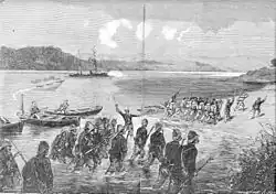 Kriegsschiffe vor dem Fort Thuan AnLandung französischer Soldaten