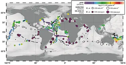 Die Stickstofffixierung, d. h. die Reduktion von Distickstoff (N2) zu biologisch verfügbaren Stickstoffverbindungen (vermittelt durch Nitrogenasen genannte Enzyme), ist eine wichtige Stickstoffquelle für aquatische Ökosysteme. Viele Jahrzehnte lang wurde die Bedeutung der N2-Fixierung stark unterschätzt. Die Annahme, dass die N2-Fixierung nur über Cyano­bakterien wie Trichodesmium und Richelia erfolgt, führte zu der Schlussfolgerung, dass in den Ozeanen der Stickstoffausstoß den Eintrag übersteigt. Die Forschung hat jedoch inzwischen ergeben, dass der Nitrogenasekomplex eine lange und variable Evolutions­geschichte hat. Durch den Einsatz der Polymerase-Kettenreaktion (PCR) ist es heute nicht mehr erforderlich, die N2-fixierenden Mikroorganismen zwecks Identifikation zu kultivieren oder zu mikroskopieren. So konnten durch Sequenzierung von PCR-amplifizierten Fragmenten des Nitrogenase-Gens nifH weitere marine N2-fixierende Mikroorganismen gefunden werden. Etliche Studien haben gezeigt, dass nifH und die Nitrogenase als das die Stickstofffixierung katalysierende Enzym den verschiedenen Teilen der Ozeane weit verbreitet ist.[12]
