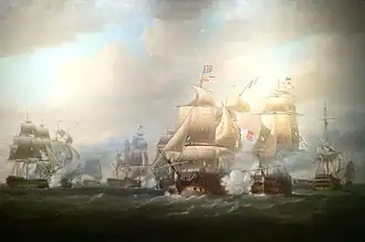- ↑ Diese Entscheidung wurde sowohl damals als auch im Nachhinein heftig kritisiert: Der Historiker William James kommentierte, dass: Wenn die Superb das hinterste französische Schiff gestellt hätte, wie sie es im Laufe weniger Stunden hätte tun können, [...] wäre die Angelegenheit nach vernünftiger Berechnung zugunsten der Briten ausgegangen.