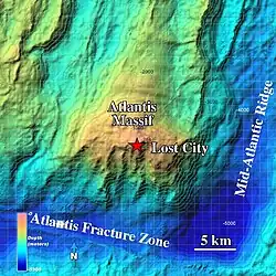 Besondere Bekanntheit erlangte das Massiv im Jahre 2000, als bei Forschungstauchfahrten durch das Tiefsee-U-Boot Alvin (DSV-2) zahlreiche hydrothermale geologische Schlote entdeckt wurden. Der Besatzung von Alvin um die Forscherin Deborah Kelley (University of Washington, Seattle) bot sich der Anblick von Gruppen aus hohen weißen Zinnen und Säulen, die nahezu wie die Reste einer versunkenen Stadt wirkten. Diese bis zu Dutzenden von Metern hohen Türme bestehen aus kristallisierten Mineralien, die entstehen, wenn heißes Quellwasser auf das kalte Wasser der Tiefsee trifft. Dieses heiße Quellwasser tritt vermutlich bereits seit etwa 30.000 Jahren im Atlantis-Massiv aus. Das Gebiet wurde in Anlehnung an den Mythos von Atlantis Lost City (auf Deutsch „Verlorene Stadt“) benannt.