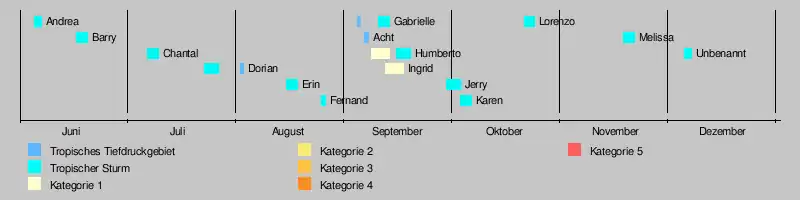 Die Atlantische Hurrikansaison 2013 begann offiziell am 1. Juni und endete am 30. November. Während dieser Periode bilden sich üblicherweise die meisten Hurrikane, da nur zu dieser Zeit geeignete Bedingungen existieren, wie etwa ein warmer Ozean, feuchte Luft und wenig Windscherung, um die Bildung von tropischen Wirbelstürmen zu ermöglichen. Die Saison 2013 war die erste seit der Saison 1994, in der sich kein Major-Hurrikan bildete. Der erste Sturm der Saison, Andrea, bildete sich am 5. Juni und der letzte Sturm der Saison, ein unbenannter subtropischer Sturm, löste sich am 7. Dezember auf. Im Laufe der Hurrikansaison bildeten sich nur zwei Hurrikane, Humberto und Ingrid, so wenige wie seit der Hurrikansaison 1982 nicht mehr.