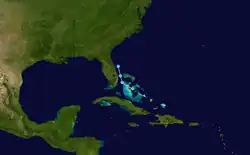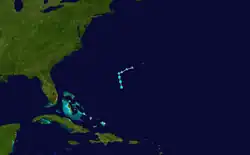 Am 21. August begann das National Hurricane Center eine westwärts ziehende atmosphärische Störung über den Bahamas zu beobachten.[72] Als sie sich am 23. August an der Südspitze Florida befand, wurde ihr großes Potential zugesprochen, sich zu einem Sturm zu entwickeln.[73] In der Folge zog das System in nordöstlicher Richtung auf den Atlantik hinaus, wo es sich am 26. August bei östlicher Zugrichtung zum Tropischen Tiefdruckgebiet Sechs intensivierte.[74] Am Abend des folgenden Tages wurde es zum Tropischen Sturm Erin hochgestuft. Erin zog jetzt sehr langsam nach Westen.[75] Am nächsten Tag zog Erin etwas schneller nach Nordnordwest und schwächte sich im Laufe des Tages aufgrund starker Scherwinde in höheren Luftschichten wieder zu einem tropischen Tiefdruckgebiet ab.[76][77][78] Am 29. August wurde Erin zu einem außertropischen Sturmtief erklärt und ging in der Nacht in einem größeren Tiefdruckgebiet östlich von Kanadas auf.[76][79]