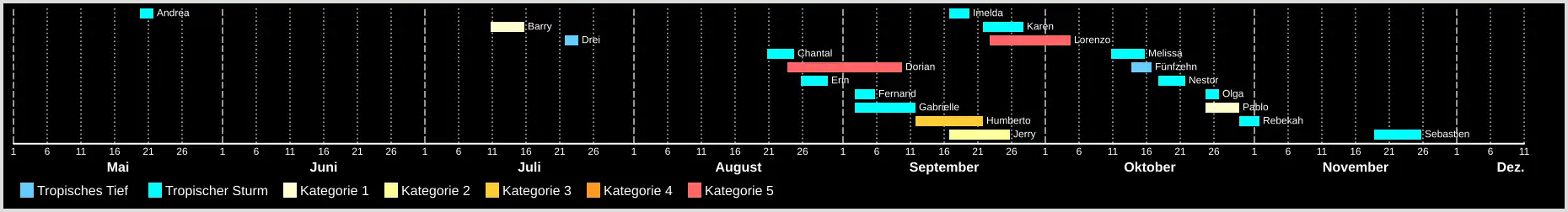 Die atlantische Hurrikansaison 2019 hatte durch die Bildung des subtropischen Sturms Andrea am 20. Mai einen Frühstart; es ist das fünfte Jahr hintereinander, dass sich vor dem 1. Juni ein tropischer Wirbelsturm im nördlichen Atlantischen Ozean bildet. Das ist das erste Mal seit Beginn der Satellitenbeobachtungen, dass dies geschah. Einen Zeitraum von vier aufeinanderfolgenden Jahren mit einem Frühstart der Saison gab es zuvor in den Jahren 1951–1954.[1] Mit Hurrikan Dorian und Hurrikan Lorenzo gab es außerdem erstmals seit Beginn der satellitengestützten Beobachtung in vier aufeinanderfolgenden Jahren mindestens einen Kategorie-5-Hurrikan.[2] Die Saison zählt zudem zu den wenigen Saisons, in denen sich mehr als ein Kategorie-5-Hurrikan gebildet hat.