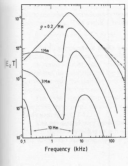 Der ionosphärische Wellenleiter ist dispersiv. Seine Ausbreitungseigenschaften werden durch eine Übertragungsfunktion beschrieben, die hauptsächlich von der Entfernung ρ und der Frequenz f abhängig ist. Im VLF-Bereich und bei Entfernungen größer als 1000 km ist nur noch der Mode Nr. 1 von Bedeutung. Die geringste Dämpfung findet bei etwa 15 kHz statt. Der ionosphärische Wellenleiter verhält sich demnach wie ein Bandpass (Abb. 2), so dass bei Entfernungen größer als etwa 5000 km das 15-kHz-Signal dominiert.