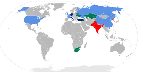 Diese vier Staaten verfügen über Kernwaffen, sind aber dem Atomwaffensperrvertrag (NVV) nicht beigetreten oder haben nukleare Sprengsätze nach 1968 getestet. Nordkorea trat dem NVV 1985 bei, ist aber 2003 wieder ausgetreten.