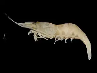 Die Art ist eine kleine Garnelenart, der Carapax erreicht beim Männchen eine Länge von 6,8 Millimeter, beim Weibchen 8,5 Millimeter. Die Tiere sind weißlich-durchscheinend, manchmal etwas gelblich gefärbt. Vorn am Carapax sitzt ein langes und schlankes Rostrum, das länger ist als die Stielglieder (Pedunkulus) der Antennen, aber kürzer als der Carapax. Das Rostrum ist gerade und etwa drei- bis siebenmal so lang wie breit, es ist beiderseits gezähnt. Der obere Rand trägt 23 bis 28 kleine Zähne, von denen die letzten 2 bis 4 nach hinten anschließend auf der Oberseite des Carapax sitzen. Auf der Unterseite sitzen 5 bis 10 gröbere Zähne nur in der äußeren (distalen) Hälfte. Der glatte Carapax besitzt am Vorderrand zwei Paare von Dornen, die supraorbitalen und antennalen Dornen. Die supraorbitalen Dornen sitzen oberhalb des Augenausschnitts (der sogenannten Orbitalgrube), seitlich des Rostrums, die antennalen nahe dem Unterrand des Augenausschnitts. Der Carapax wirkt ansonsten am Vorderende fast gerade abgeschnitten mit rechtwinkligen Ecken. Der Hinterleib oder Pleon besteht aus fünf Segmenten und dem Telson. Ihre Seitenabschnitte (Pleura) sind bei den ersten drei in Seitenansicht breit gerundet, beim vierten und fünften spitzeckig. Das Telson ist genau so lang oder wenig länger als das sechste Segment. An seiner breit gerundeten Hinterkante sitzt eine Reihe von acht bis neun starken Dornen.