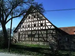 - Haus Nr. 1 u. 2: Fachwerkscheune, wohl noch des 17. Jahrhunderts, mit Schleppgauben[14]
