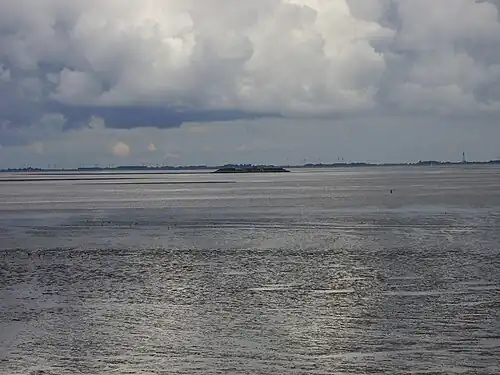 ![]() Außenems nördlich von Delfzijl mit Blick auf das Ostfriesische Gatje und den deutschen Küstenabschnitt bei Campen. Im Vordergrund Gaseiland op de Hond. | ||