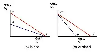 Wenn nun Außenhandel betrieben wird, kann eine Volkswirtschaft mehr von beiden Gütern konsumieren. Die Relation wird dabei wieder durch die Budgetgerade des Landes bestimmt. Die Steigung dieser Geraden entspricht exakt dem negativen relativen Preisverhältnis von Gut i zu Gut j (= −Pi/Pj). Der blaue Bereich in der Grafik stellt die mögliche Konsumausweitung ausgehend von Punkt 2 dar. Es könnten nun ein jeder Punkt unter oder auf der Konsummöglichkeitskurve konsumiert werden. Als Ergebnis ist es also theoretisch möglich, dass alle Wirtschaftssubjekte einer Volkswirtschaft mehr konsumieren können. Damit stellt der Außenhandel eine potentielle Quelle des Gewinns für alle dar.[4]