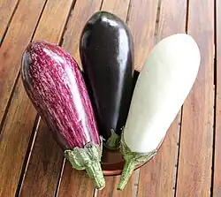 Die in Europa bekannteste Form ist Solanum melongena var. esculentum mit ihrer keulenförmigen, dunkelviolett bis schwarz erscheinenden, etwa 20 cm langen Frucht. Andere Formen können aber auch weiß (eierfarbig, daher der Name) oder auch weiß und violett sein. Bei beginnender Überreife treten Verfärbungen zum Braunen und Gelben hin auf, und der Glanz der Früchte verschwindet zunehmend. Da insbesondere unreife und junge Früchte der häufig in Europa angebauten, schwarzen, etwa 20 cm langen Aubergine aufgrund ihres Gehaltes an Bitterstoffen und Solanin nicht zum Rohverzehr geeignet sind,[5] werden sie gedünstet, gebraten oder gekocht als Gemüse gegessen. Andere asiatische Formen sind aber teilweise auch im rohen Zustand genießbar. Auberginen können wie andere Nachtschattengewächse geringe Mengen Nikotin enthalten. Die Menge schwankt je nach Untersuchung zwischen „nicht nachweisbar“ und 100 Mikrogramm pro Kilogramm Frucht. Gelegentlich wird behauptet, der Nikotingehalt der Aubergine sei besonders hoch. Dieses Gerücht beruht auf einer alten Analyse, die sich inzwischen mehrfach als fehlerhaft erwiesen hat.[6]