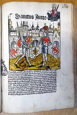 Berthold Meier (1451–1465), Abt und Chronist des Aegidienklosters, verfasste kurz nach 1457 die „Legenden und Geschichten des Klosters St. Aegidien zu Braunschweig“ in niederdeutscher Sprache. Das 76 Blätter umfassende Werk widmete er dem Rat der Stadt. Die Handschrift wird heute im Kestner-Museum in Hannover aufbewahrt. In ihr befindet sich die bekannteste Darstellung des Heiligen Auctor. Die Miniatur, die um 1460 von einem unbekannten Künstler geschaffen wurde, misst 242 × 165 mm.[5] Sie zeigt St. Auctor mit Schwert und Bischofsstab über der Stadt Braunschweig schwebend. Am linken unteren Bildrand erkennt man mehrere Benediktinermönche dankend zu ihm aufblicken, am rechten unteren Rand den Bürgermeister und den Rat der Stadt. Beiden zu Füßen sind die Wappen des Bischofs (mit Mitra) sowie der Stadt Braunschweig (der steigende, rote Braunschweiger Löwe) sichtbar.