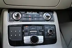 Bei Audi steht neben der primären Bedieneinheit eine Reihe von Tasten zur Verfügung, mit denen die Hauptfunktionen direkt anwählbar sind. Hinzu kommt ein separates Bedienteil zur Steuerung der Klimaanlage.