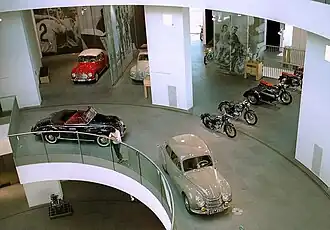 Die Dauerausstellung des Museums ist auf zwei Ebenen in Vor- und Nachkriegsjahre unterteilt. Außerdem gibt es wechselnde Sonderausstellungen und einen Museumsladen. Die Ausstellung wird zusätzlich durch eine Technikgalerie mit Exponaten ergänzt, die Themen wie Materialkunde aufgreifen und Motorentechnologie vermitteln. Der Geschichte des Motorsports sind eigene Bereiche gewidmet. Die Auto-Union-Rennwagen, die Rallye-Ära sowie die DTM- und Le-Mans-Siege jeweils mit Originalfahrzeugen präsentiert.[2]