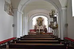 Das Kircheninnere zeigt ein vierjochiges Langhaus, die zwei westlichen Joche haben Kreuzgratgewölbe aus 1728, die zwei östlichen Joche haben Platzlgewölbe aus 1778, alle Gewölbe auf Gurten auf Pilastern. Der Triumphbogen ist korbbogig. Die Apsis hat ein Stichkappengewölbe.