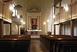 - Die West- und Ostempore, auf je fünf hölzernen Stützen in Form von dorischen Säulen ruhend, haben getrennte Eingänge von außerhalb des Kirchengebäudes, jeweils von Osten und Westen. Ursprünglich gab es einen gemeinsamen Aufgang direkt vom Hauptschiff aus. Diese baulichen Änderungen erfolgten in den 1880er Jahren.[4] Für die Orgel ist eine auf der Turmseite errichtete, sich in den Kirchenraum vorwölbende, Empore eingerichtet. Die Balustraden der Emporen sind mit Holztäfelchen gefeldert, aber ohne weiteren Schmuck.