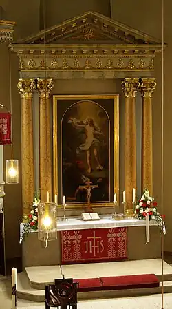 Es zeigt die Auferstehung Christi und wird beiderseits von je zwei korinthischen Säulen gerahmt, deren Schäfte mit Stuckmarmor gezeichnet sind. Das Bild schuf der Fürther Kunstmaler Elias Oehme.[2] Auf den Säulen liegt wie bei einem kleinen Tempel ein dreieckiger Giebel, der das vergoldete Auge Gottes enthält. Das Altarbild wurde nach 1900 durch ein neu gemaltes des Münchner Künstlers Theodor Baierl ersetzt, das 1956 wieder gegen das ursprüngliche ausgetauscht wurde. (Das nicht im Altar sichtbare Bild schmückt die Sakristei.)[4]