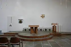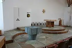 In Zusammenarbeit mit dem Architekten Jan Bossard schuf der Künstler Alois Spichtig ein integrales Konzept, das sich vom Weg zur Kirche durch das Pfarreizentrum bis in die Kirche zum Altarbereich hinzieht.[12]