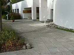 Das Quadrat für das Irdische oder Diesseitige und der Kreis für das Himmlische oder Jenseitige spielen im künstlerischen Konzept der Kirche St. Maria Magdalena eine zentrale Rolle. So beschreitet der Gottesdienstbesucher vom Dorfzentrum her kommend zunächst einen Plattenweg, der aus quadratischen Steinplatten besteht. Dieser Plattenweg symbolisiert den Lebensweg der Maria Magdalena, deren Leben Zäsuren und Brüche aufwies, welche in der Aneinanderreihung der quadratischen Bodenplatten dargestellt werden, die dadurch ungeordnet wirken. Beim Beschreiten dieses Weges zur Kirche hin soll der Gottesdienstbesucher das Ungeordnete seiner eigenen Gedanken hinter sich lassen und parallel zur zunehmenden Ordnung des Plattenweges selber ruhig und konzentriert werden. Der im Plattenweg angedeutete Lebensweg der Maria Magdalena, der zunächst Zäsuren und Brüche aufweist und dann durch die Begegnung mit Jesus ruhig und klar wird, weist den Gottesdienstbesucher darauf hin, dass der ungeordnete Lebensweg des Menschen ruhiger und klarer wird, je näher dieser zu Gott führt.