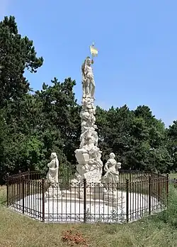 Auf einem dreiseitigen Stufenpostament mit den hll. Maria, Martha und Maria Magdalena befindet sich eine Säule mit freiem Wolkenaufbau sowie ein Sarkophag und auf der Säule eine Statue des auferstandenen Christus.[3]