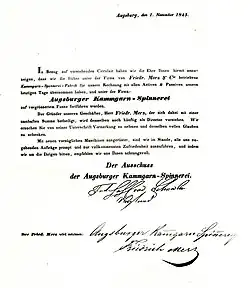 - ↑ a b c Frühe Dokumente und Zeitungsartikel zur Augsburger Kammgarn-Spinnerei. In: Pressemappe 20. Jahrhundert. ZBW - Leibniz-Informationszentrum Wirtschaft, abgerufen am 10. Dezember 2021.
