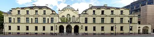 Die Augsburger Synagoge dient als Kultuszentrum für die jüdische Gemeinde in Augsburg. So feiert die Israelitische Kultusgemeinde Schwaben-Augsburg dort jeden Freitagabend und jeden Samstagmorgen den Schabbat.[1] Erbaut wurde die Synagoge zwischen 1914 und 1917 nach den Entwürfen der Architekten Fritz Landauer und Heinrich Lömpel in der Halderstraße unweit des Königsplatzes. Durch die Reichspogromnacht und die später durchgeführten alliierten Luftangriffe wurde auch die Synagoge in Augsburg in Mitleidenschaft gezogen. Erst 1963 konnte ein kleiner Teil der Synagoge wieder von der Gemeinde genutzt werden. Zwischen 1974 und 1985 wurde die Synagoge schließlich vollständig wiederhergestellt. Seit der 1985 erfolgten Wiedereröffnung beherbergt sie auch das Jüdische Museum Augsburg Schwaben.[2] Die Synagoge kann im Rahmen des Museumsbesuchs besichtigt werden.
