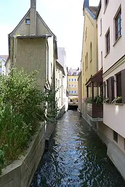 Spätestens im Mittelalter wurden Kanäle gegraben, die Wasser des Lechs von Süden her in die tiefer gelegenen Areale der inzwischen angewachsenen Stadt und im Norden wieder aus der Stadt heraus leiteten. Diese verliefen nicht wie die römische Fernwasserleitung oben auf der Hochterrasse, sondern etliche Meter tiefer am Westrand des Lechtals. Vier Lechkanäle sind im Augsburger Stadtrecht des Jahres 1276 namentlich bezeichnet.[11][12] Die Lechkanäle wurden immer wieder erweitert und verändert. Durch diesen Wasserbau entstand das heute vorliegende Netzwerk offener, oberirdischer Kanäle, die beträchtliche Volumenströme Fließwasser führen.