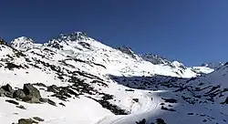 Piz Futschöl (links), Vadret da Futschöl (mittig), darüber der Südgipfel des Piz Blaisch Lunga (Augstenberg), rechts daneben der Nordgipfel