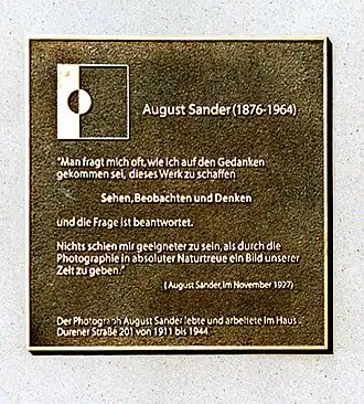 - ↑ Gunther Sander: Aus dem Leben eines Photographen. In: August Sander. Menschen ohne Maske, Photographien 1906–1952. Schirmer/Mosel, München 1976 (Sonderausgabe des 1971 im C. J. Bucher-Verlag erschienenen Werkes August Sander, Menschen ohne Maske), S. 9.