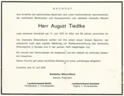- ↑ a b Unpolitisch: Der Billardspieler August Tiedtke. In: Sabine Gerasch: Geschichte vom Band. 1. Auflage. de Gruyter, 1997, ISBN 3-11-015274-6, S. 154–162.