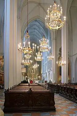 Die Kirchenbänke in den östlichen Langhausjochen mit ihren reich ornamentierten Wangen und biblischen Szenen an den Stirnseiten wurden um 1730 von Johann Baptist Straub ausgeführt und standen ursprünglich in der ehemaligen zweiten Schwarzspanierkirche in der Alservorstadt. Die Bänke mit intarsierten Wangen mit dem jeweiligen Emblem Kaiser Karls VI. stammen aus der unter Kaiser Joseph I. und unter Maria Theresia veränderten Kammer- oder Josefskapelle in der Wiener Hofburg und aus dem ehemaligen Jakoberkloster.