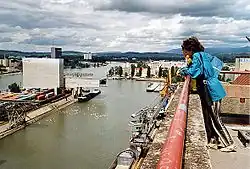 Die Schweizerischen Rheinhäfen betreiben eine Revierzentrale, die den Verkehr der Rheinschifffahrt zwischen Märkt (Deutschland) und Rheinfelden kontrolliert.[10] Sie ist an das Melde- und Informationssystem Binnenschifffahrt (MIB) angeschlossen. Das 1943 erbaute turmartige Gebäude mit auskragendem Obergeschoss befindet sich an der Einfahrt des Rheinhafens Kleinhüningen , direkt an der Grenze zu Deutschland südlich der Dreiländerbrücke. Es ist im Inventar der schützenswerten Ortsbilder der Schweiz aufgeführt.[11]