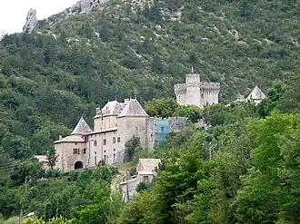 - Die sich oberhalb des Ortes erhebende Burg stammt ursprünglich aus dem Mittelalter; sie wurde jedoch von ihren Besitzern in den nachfolgenden Jahrhunderten immer wieder erweitert. Der heutige Gebäudekomplex befindet sich in Privatbesitz, er ist jedoch in den Sommermonaten zu besichtigen. Die Burg wurde im Jahr 1950 in Teilen als Monument historique eingestuft.[2]
