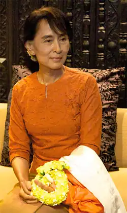 Aung San Suu Kyi (birmanisch အောင်ဆန်းစုကြည်; []; * 19. Juni 1945 in Rangun, Britisch-Birma) ist eine birmanische Politikerin. Sie setzte sich seit den späten 1980er Jahren für eine gewaltlose Demokratisierung ihres Heimatlandes ein und wurde als herausragende Vertreterin im Freiheitskampf gegen Unterdrückung und soziale Ungerechtigkeit gewürdigt.[1] 1991 erhielt sie hierfür den Friedensnobelpreis.