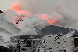 Am Morgen des 14. April 2010 brach direkt in der Gipfelcaldera des Vulkans eine etwa zwei Kilometer lange Spalte auf. Aus fünf Kratern traten große Mengen Lava aus. Über dem Gletscher stiegen mehrere tausend Meter hohe Dampf- und Aschewolken auf.[48][49][50] Das Gebiet wurde erneut evakuiert.
