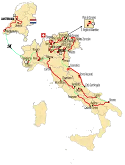 Der Giro 2018 begann mit drei Etappen in Israel, zum Teil durch den Einfluss von Sylvan Adams, der zu diesem Zeitpunkt die Radsport-Mannschaft Israel Cycling Academy aufbaute.[17] Nach den drei Etappen und einem Pausentag für den Transfer wurde der Giro auf Sizilien fortgesetzt. Dies war bislang das einzige Mal, dass Etappen einer Grand Tour außerhalb Europas stattfanden.