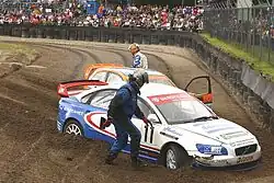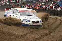 Im Rallycross sind als Auslaufzonen noch immer fast ausschließlich Kies- respektive Sandbetten zu finden.[43] Die vorbereiteten Gräben werden aus Kostengründen meist mit den auf dem Gelände zur Verfügung stehenden Materialien gefüllt, wodurch es sich fast immer um grob gesiebte Erde oder Sand statt gewaschenem Kies in definierter Korngröße handelt. Unmittelbar vor den Renntagen, bei starker Verdichtung auch in den Rennpausen, wird diese Bettfüllung durch den Einsatz von geeigneten Maschinen aufgelockert und danach wieder geebnet.