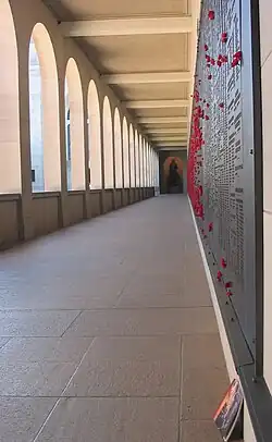 Vor der Halle der Erinnerung liegt ein schmaler Hof mit einer ewigen Flamme inmitten eines Wasserbeckens. Das Becken wird von Gehwegen und Rosmarinbüschen flankiert. Oberhalb des Innenhofs erstrecken sich auf beiden Seiten lange gedeckte Säulengänge mit dem Ehrenverzeichnis (Roll of Honour), bronzenen Gedenktafeln mit den Namen aller 102.000 australischen Militärangehörigen, die im Einsatz ihr Leben ließen. In der gesamten Wand der westlichen Galerie sind die Namen derer eingraviert, die im Ersten Weltkrieg gefallen, die Wand der östlichen mit den Namen der Gefallenen des Zweiten Weltkriegs und späterer Konflikte.