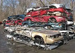 Die Fertigung von Automobilen verbraucht darüber hinaus erhebliche Mengen an Rohstoffen, Wasser und Energie. Greenpeace geht von einem Wasserverbrauch von 20.000 l für einen Mittelklassewagen aus.[48] Die Zeitschrift Der Spiegel berechnete 1998 für die Herstellung eines Pkw der oberen Mittelklasse (etwa Mercedes E-Klasse) gar 226.000 l Wasser.[49] Die Wasserwirtschaft sieht branchenpositive 380.000 l für ein Fahrzeug als notwendig an. Das Automobil wird derzeit (2013) zu 85 Prozent recycelt und zu 95 Prozent verwertet. Bei metallischen Bestandteilen beträgt die Recyclingquote 97 Prozent.[50]