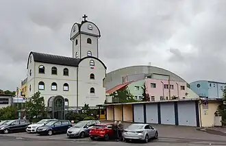 Die Kirche ist ein dreigeschossiger Bau mit Turm. Das Langhaus schließt mit einem Tonnendach ab. Es wird von mehreren halbrunden Fenstern durchlichtet. Der Turm wurde als Chorturm geschaffen. Der charakteristische Dachaufbau wird durch ein Kreuztonnengewölbe gebildet. Das Obergeschoss ragt über die Breite des Turmes hervor. Der Turm ist 30 Meter hoch. Der Aufbau wird von einem plastischen Kreuz bekrönt, das in der Nacht angestrahlt wird und von der Autobahn aus zu sehen ist. Der Eingang zum Gotteshaus erfolgt über einen gläsernen Vorbau. Hier ist ein Andachtsraum mit einem Taufbecken zu finden, das als Brunnen gestaltet wurde. Im Inneren wird der Raum von einer vierseitigen Empore geprägt.