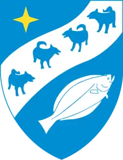 Das Wappen wurde von Maria Dorph gestaltet. Es ist blau mit einem diagonalen weißen Band. Im oberen linken Bereich befindet sich ein gelber vierzackiger Stern, der für ein gemeinsames Ziel steht, auf blauem Grund, welcher das Klima symbolisiert. Die vier Hunde auf dem weißen Band symbolisieren die vier Städte der Kommune sowie das Meereis. Die Hunde schauen sich an und stehen somit für die Zusammenarbeit. Im unteren rechten Bereich befindet sich ein Heilbutt auf blauem Grund. Der Fisch symbolisiert die wirtschaftliche Grundlage der Kommune und die blaue Farbe das Meer.[8]