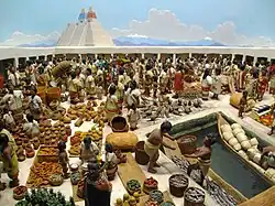 Wie alle Völker Mesoamerikas war auch die aztekische Gesellschaft um den Maisanbau herum organisiert. Die feuchte Umgebung im Tal von Mexiko mit seinen vielen Seen und Sümpfen erlaubte eine intensive Landwirtschaft. Neben Mais wurden vor allem Bohnen, Kürbisse, Chilis und Amarant angebaut. Die ausgeklügelten Bewässerungssysteme der Azteken ermöglichte eine hohe landwirtschaftliche Produktivität und das Wachstum der Städte.[40] Das Überangebot an Nahrungsmitteln ermöglichte es einem bedeutenden Teil der aztekischen Bevölkerung, sich anderen Berufen als der Nahrungsmittelproduktion zu widmen. Neben der häuslichen Nahrungsmittelproduktion webten die Frauen Textilien aus Agavenfasern und Baumwolle. Männer beschäftigten sich auch mit handwerklichen Spezialisierungen wie der Herstellung von Keramik, Obsidian- und Feuersteinwerkzeugen und von Luxusgütern wie Perlen- und Federarbeiten sowie der Herstellung von Werkzeugen und Musikinstrumenten.[41] Es gibt Hinweise auf spezialisierte Märkte für Güter und in einigen archäologischen Stätten wurden große Stadtviertel gefunden, in denen offenbar nur eine einzige handwerkliche Spezialität ausgeübt wurde.[40]