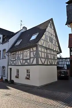 Das kleine Fachwerkhaus einer Hofreite mit steilem Satteldach und Giebelüberhang hat ein aus Backsteinen erneuertes Erdgeschoss. Der Bau besitzt ein bildhaftes Fachwerk mit langen, s-förmigen Kopfstreben und Feuerböcken unter den Fenstern.