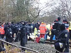 Am 27. November 2011 blockierten vier Mitglieder der bäuerlichen Notgemeinschaft einen Schienenabschnitt des Castor-Transports 2011, indem sie sich an einer Pyramide aus Beton und Stahl[2] festketteten. Wegen des raffinierten Aufbaus der Pyramide gelang es Spezialeinheiten der Polizei nicht, die Aktivisten vom Gleisbett zu entfernen, wodurch sich der Castortransport verzögerte. Nach ca. 15 Stunden lösten die Angeketteten ihre Blockade freiwillig auf.